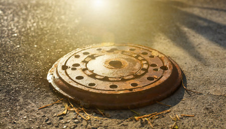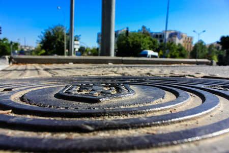 Close-up of the metal manhole cover in the sunshine.