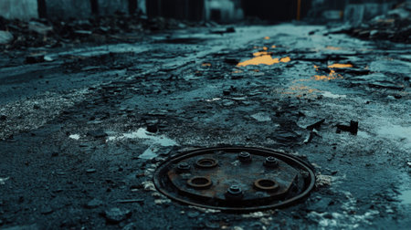 This image captures a desolate urban street with a rusty manhole cover surrounded by puddles and debris, conveying a sense of decay and neglect.