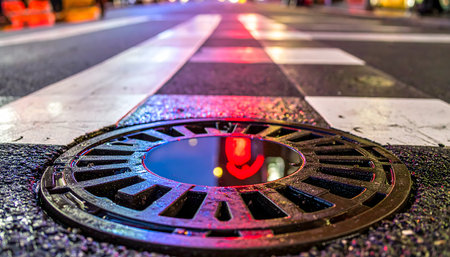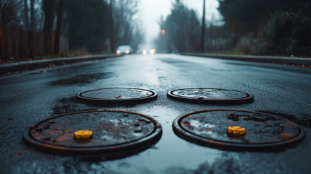 A captivating urban scene featuring manhole covers on a wet road during rainfall, illuminated by soft yellow lights in the distance, evoking a serene mood.