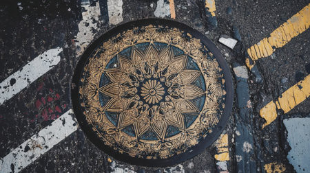 Beautifully crafted manhole cover features intricate floral designs and artistic elements, set against a vibrant urban street backdrop, showcasing urban artistry.