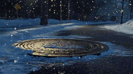 A tranquil winter scene captures delicate snowfall over a manhole cover on a city street. The soft light creates an inviting atmosphere, highlighting the serenity of the cold evening.