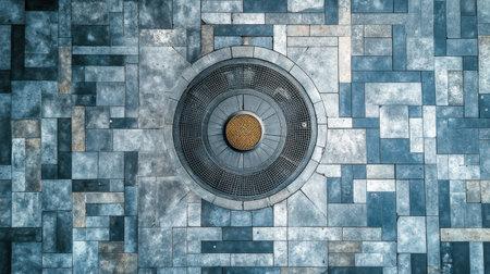 A close-up aerial view of a circular drain cover set within stylishly patterned paving tiles in cool tones, displaying modern urban design elements and textures.