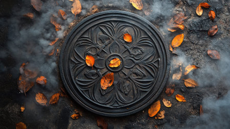 This intriguing image showcases an ornate round manhole cover surrounded by vibrant autumn leaves and swirling smoke, creating a captivating urban scene.