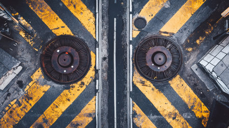 This striking aerial image captures a unique crossroad in an urban environment. The vivid yellow stripes contrast sharply with the asphalt, guiding the viewer's eye towards the circular manholes at the center.