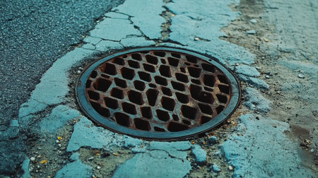 Urban street view focusing on a circular iron drainage hole at the center of a weathered road, highlighting city infrastructure