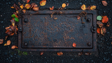 A rusted manhole cover rests on a dark asphalt surface, surrounded by colorful autumn leaves. The contrast highlights urban decay and nature's beauty.