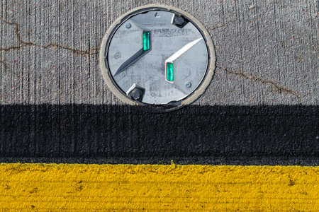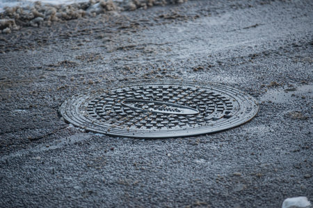 Abstract manhole cover on asphalt pavement