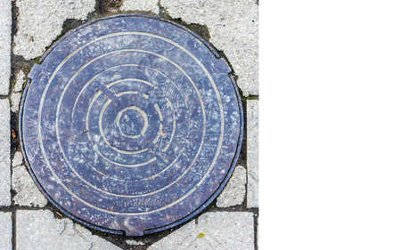 View of the old city sewer cover on the sidewalk between the tiles from above