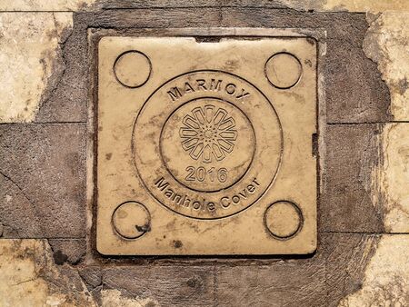 Egypt, Sharm El Sheikh - January 17, 2020: Marmox Manhole Cover 2016 sign on the sidewalk in Sharm El Sheikh. Beautiful vintage square slab with a round business logo on a shabby grunge background