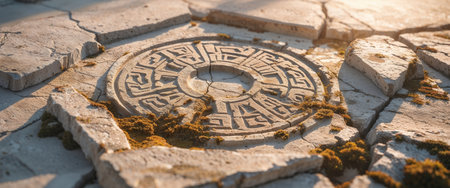 AI Generated. Weathered Stone with Ancient Carved Symbols in Sunlight
