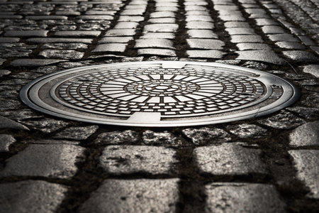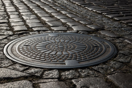 Cast iron manhole cover on cobblestone street in warm light-urban texture