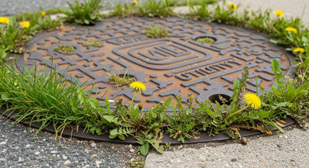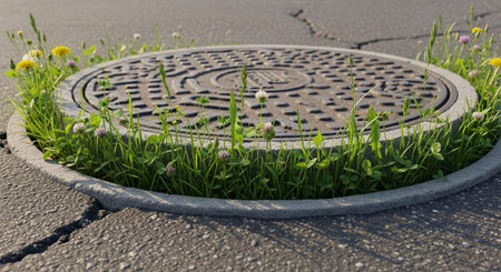 close-up of manhole cover with sewer water spilling out onto the sidewalk, created with generative ai