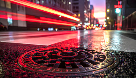 Captivating urban scene featuring a manhole cover set in cracked asphalt, illuminated by evening light, showcasing the textures of city life and decay.