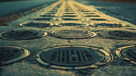 This image captures a detailed view of circular manhole covers embedded in a concrete roadway, bathed in warm sunset light that enhances textures.