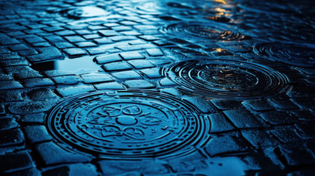 A tranquil scene showcasing dark cobblestones reflecting water puddles and intricate manhole covers after a refreshing rainfall at night.