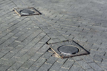 Telecommunication manhole cover on the sidewalk between the tiles during the day