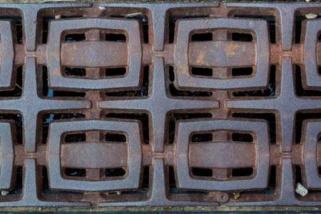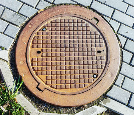 vintage metal sewage manhole closeup, round rusty surface diversity