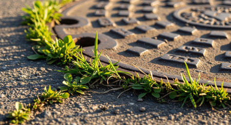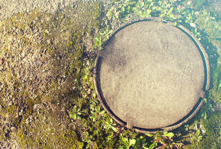 background texture of the old sewage hatch, overgrown with moss and grass with cracks in the asphalt