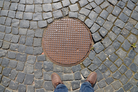View of the old city sewer cover on the sidewalk between the tiles from above