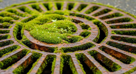 A close-up view of a rustic metal grate featuring intricate patterns, dust, and debris, capturing the essence of industrial decay and urban environments.