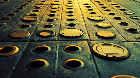 A captivating close-up of a textured surface featuring circular metal covers, with sunlight creating unique reflections and shadows in an urban setting.