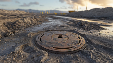 A detailed close-up of a rusty manhole cover resting on an unpaved road. The warm glow of sunset illuminates the scene, creating a serene atmosphere.