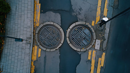 This image captures an aerial view of two round manhole covers located in an urban street setting, highlighted by yellow lines on the pavement.