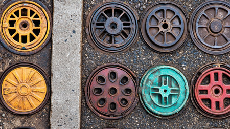 A vibrant display of various manhole covers set in an urban environment, showcasing intricate designs and a mix of colors on a street surface.