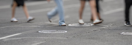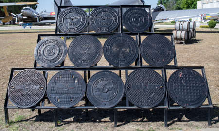 Metal covers of sewer manholes on city roads close-up.