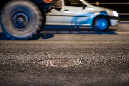 Sewer manhole on asphalt at night, cars passing by