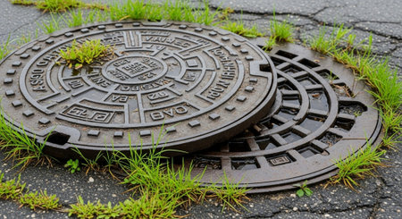 close-up of manhole cover with sewer water spilling out onto the sidewalk, created with generative ai