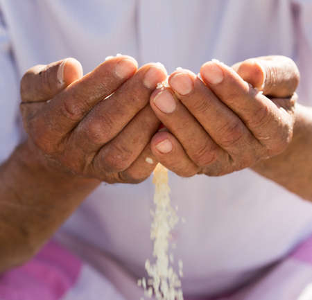 Close-up of hands of an old Indian man praying on the street.