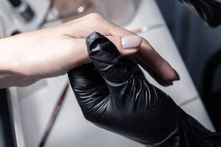 Closeup view of hands with manicure of young woman Nail treatment by a specialist in the salon Soft focus