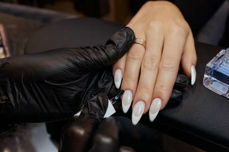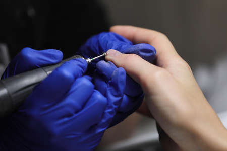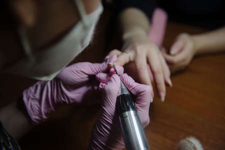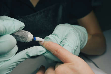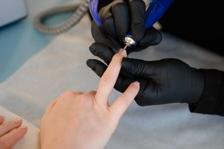 Close Up shot of hardware manicure in a beauty salon. Manicurist in protective gloves is applying electric nail file drill to manicure on female fingers