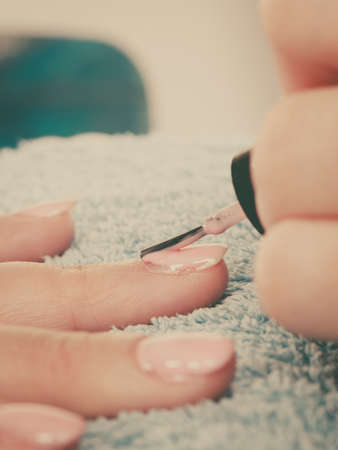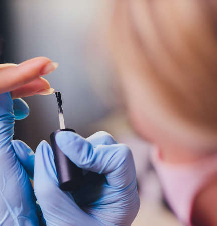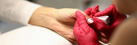 Close-up of woman using means of protection. Manicurist covering nails of client with light nail polish. Female person spending time in saloon. Beauty salon and chiropody concept