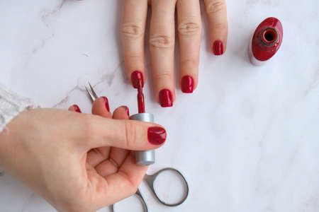 Manicure process, top view.Manicure in beauty salon.Manicure concept, flat lay. Manicurist paints nails with varnish