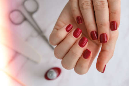 Stylish red female nails. Modern Beautiful manicure. Autumn winter nail design concept of beauty treatment. Gel nails. Skin care. Wellness. Trendy colors.