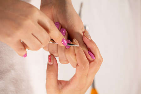 Manicurist makes a hygienic manicure with the help of an orange stick