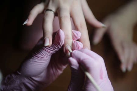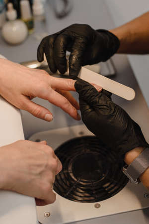 The master of nail extensions and coating with gel varnish makes correction to his client in the beauty salon