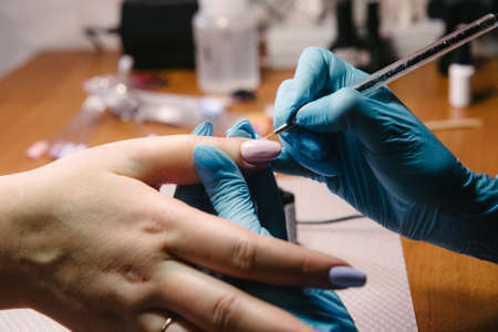 Manicurist with blue gloves rasping nails on women's hand in nail salon.