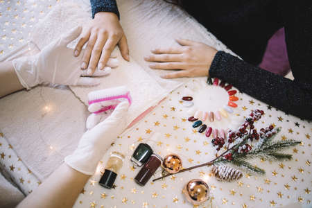 Female manicurist ready to working woman's nails. Womens manicurist hands holding pink brush and womans hands on nail table with stars, nail polish, cone, samples and Christmas lights. Ideal for blogs, websites and magazines.