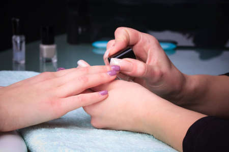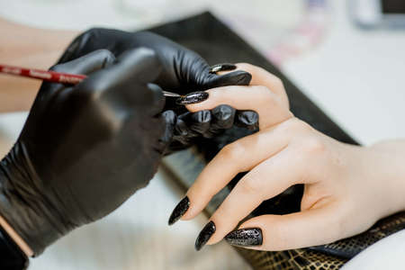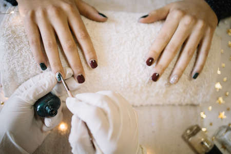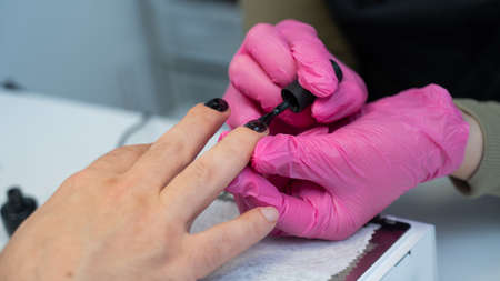 The manicure master in the beauty salon performs the procedure of coloring the client's nails. Women's fashion and beauty. self care.