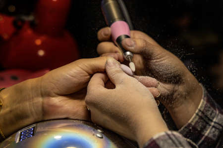 Manicurist is applying electric nail file drill to manicure on female fingers