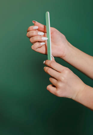 Faceless female filing long white nails doing manicure on green background