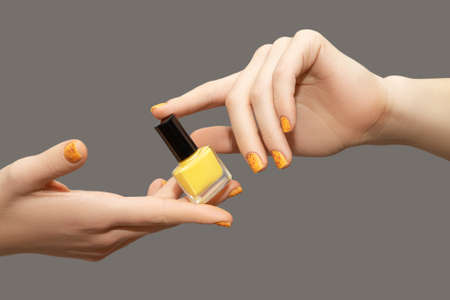 Female hands with orange nail design. Glitter orange nail polish manicure with red nail art. Woman hold yellow nail polish bottle with her fingers on gray background.