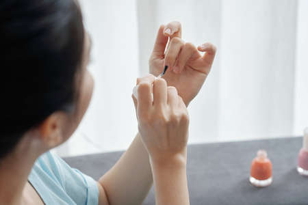 Young woman applying nail polish with brush from bottle, polishing painting fingernails with blue color enamel, doing manicure at home, perfect healthy nails care