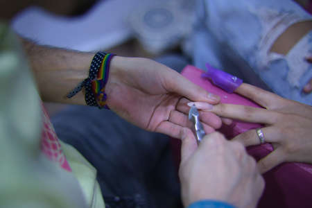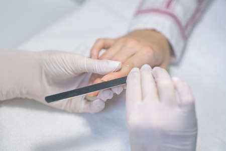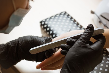 Nail filing. Close up picture of nail artists hands filing customers nails