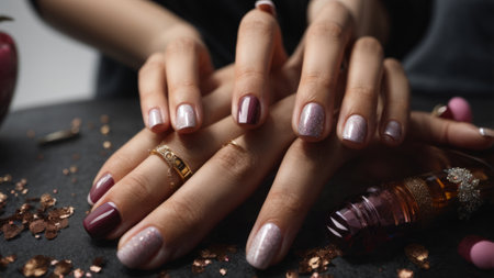 Womans hands with matte lavender and silver nails. Beauty treatment