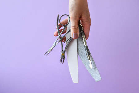 Hold manicure tools in your hand. Nail care, procedure, nail salon. Tweezers, wire cutters, pusher, orange tree stick, scissors, nail file. Pedicure, cuticle removal. Home care, Spa, beauty.