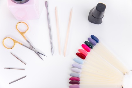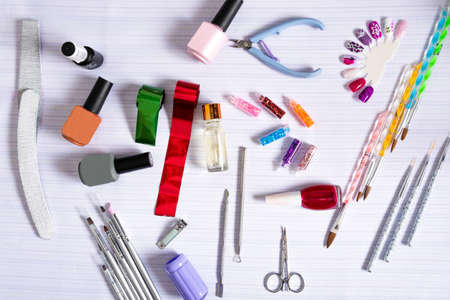 Manicure - tools for creating, gel polishes, all for the treatment of nails, the concept of beauty, care on white towel background. Banner for inscription salon. Copy space for text.